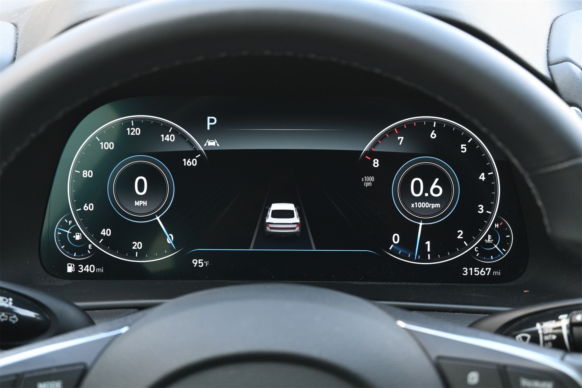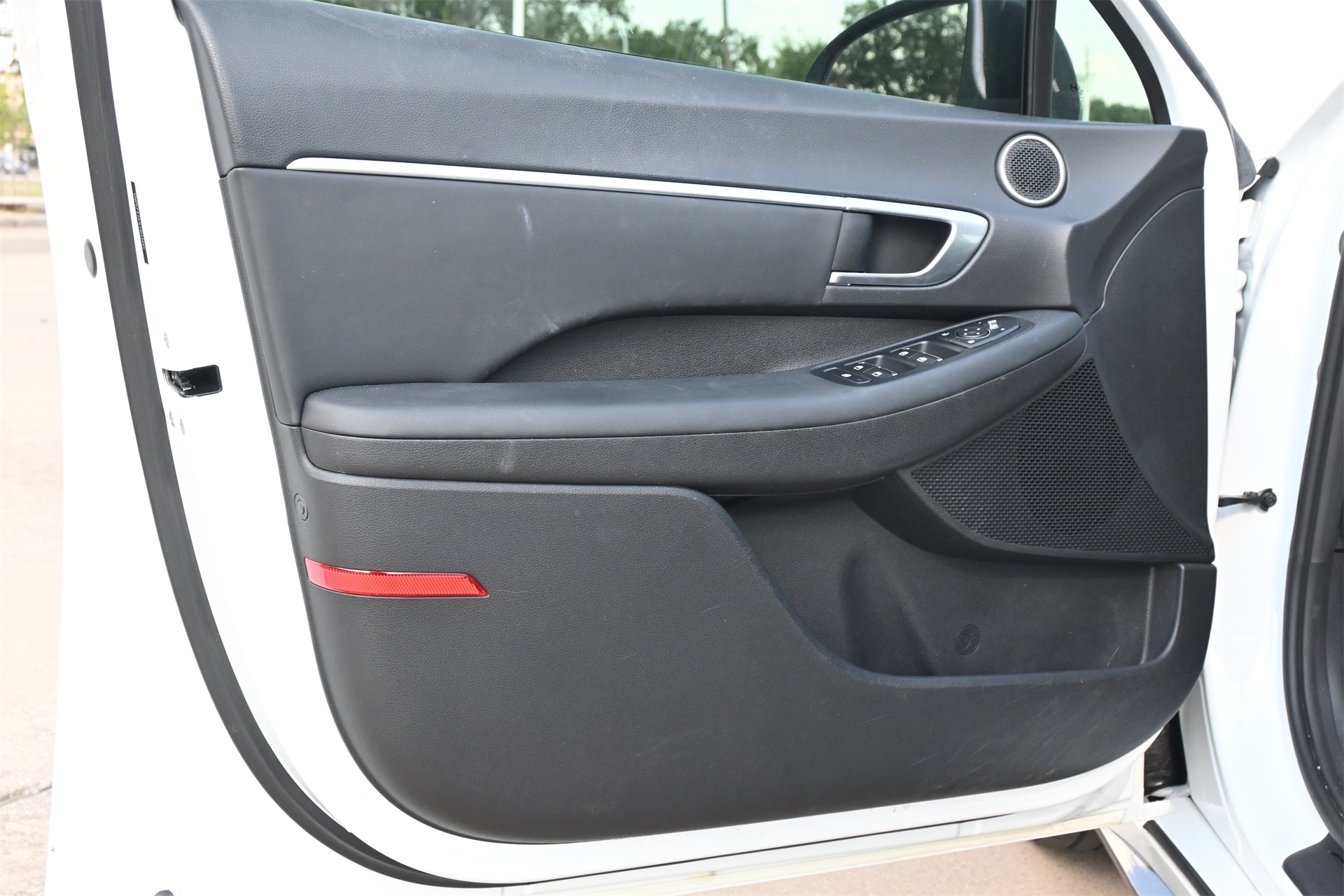 igh-beam Headlights, Automatic temperature control, Brake assist, Bumpers: body-color, Cargo Net, Carpeted Floor Mats, Delay-off headlights, Driver door bin, Driver vanity mirror, Dual front impact airbags, Dual front side impact airbags, Electronic Stability Control, Emergency communication system: Blue Link Connected Care (3-year subscription), Exterior Parking Camera Rear, Four wheel independent suspension, Front anti-roll bar, Front Bucket Seats, Front Center Armrest, Front dual zone A/C, Front reading lights, Fully automatic headlights, Heated door mirrors, Heated Front Bucket Seats, Heated front seats, Illuminated entry, Knee airbag, Low tire pressure warning, Occupant sensing airbag, Outside temperature display, Overhead airbag, Overhead console, Panic alarm, Passenger door bin, Passenger vanity mirror, Power door mirrors, Power driver seat, Power steering, Power windows, Premium Cloth Seating Surfaces, Radio data system, Radio: AM/FM/MP3/HD/SiriusXM Display Audio, Rear anti-roll bar, Rear seat center armrest, Rear side impact airbag, Rear window defroster, Remote keyless entry, Reversible Cargo Tray, Security system, Speed control, Speed-sensing steering, Speed-Sensitive Wipers, Split folding rear seat, Steering wheel mounted audio controls, Tachometer, Telescoping steering wheel, Tilt steering wheel, Traction control, Trip computer, Turn signal indicator mirrors, Variably intermittent wipers, and Wheels: 17 x 7.0J Aluminum Alloy. Quartz White FWD 8-Speed Automatic with Overdrive 2.5L I4 Black Cloth.