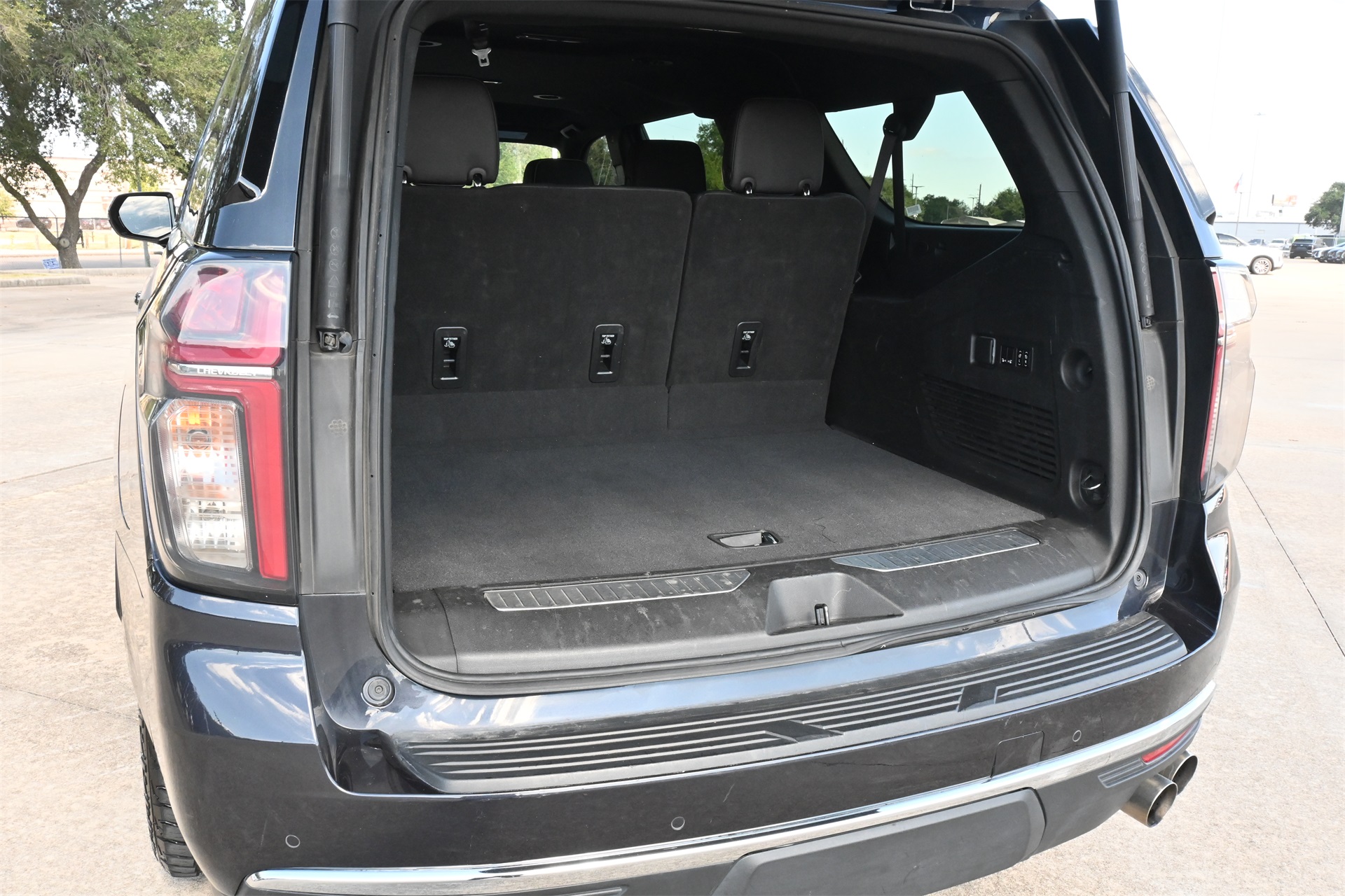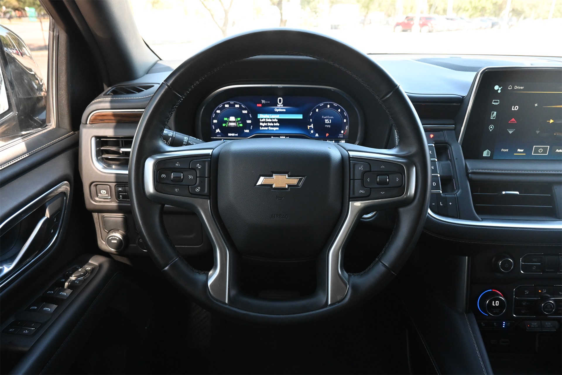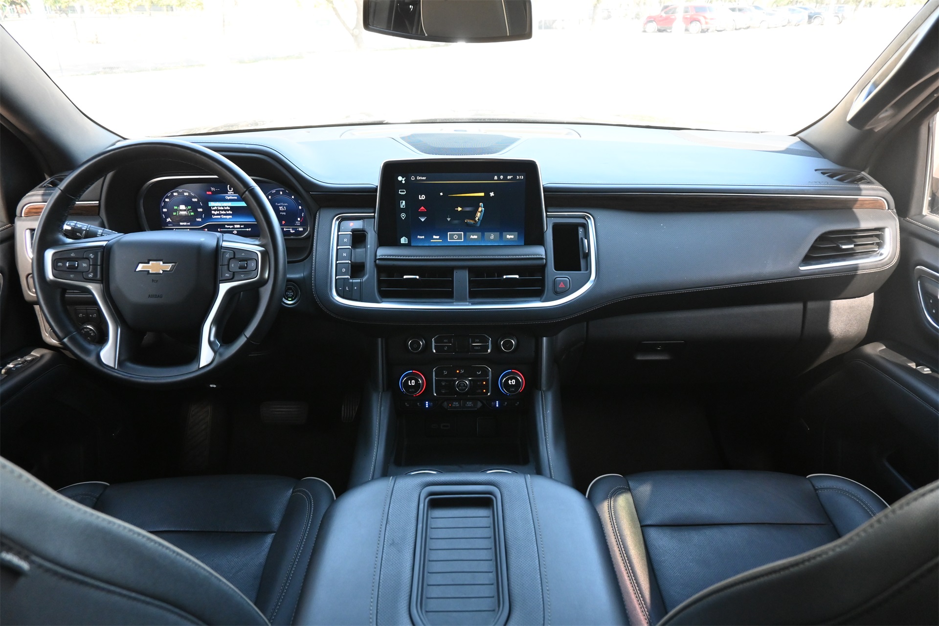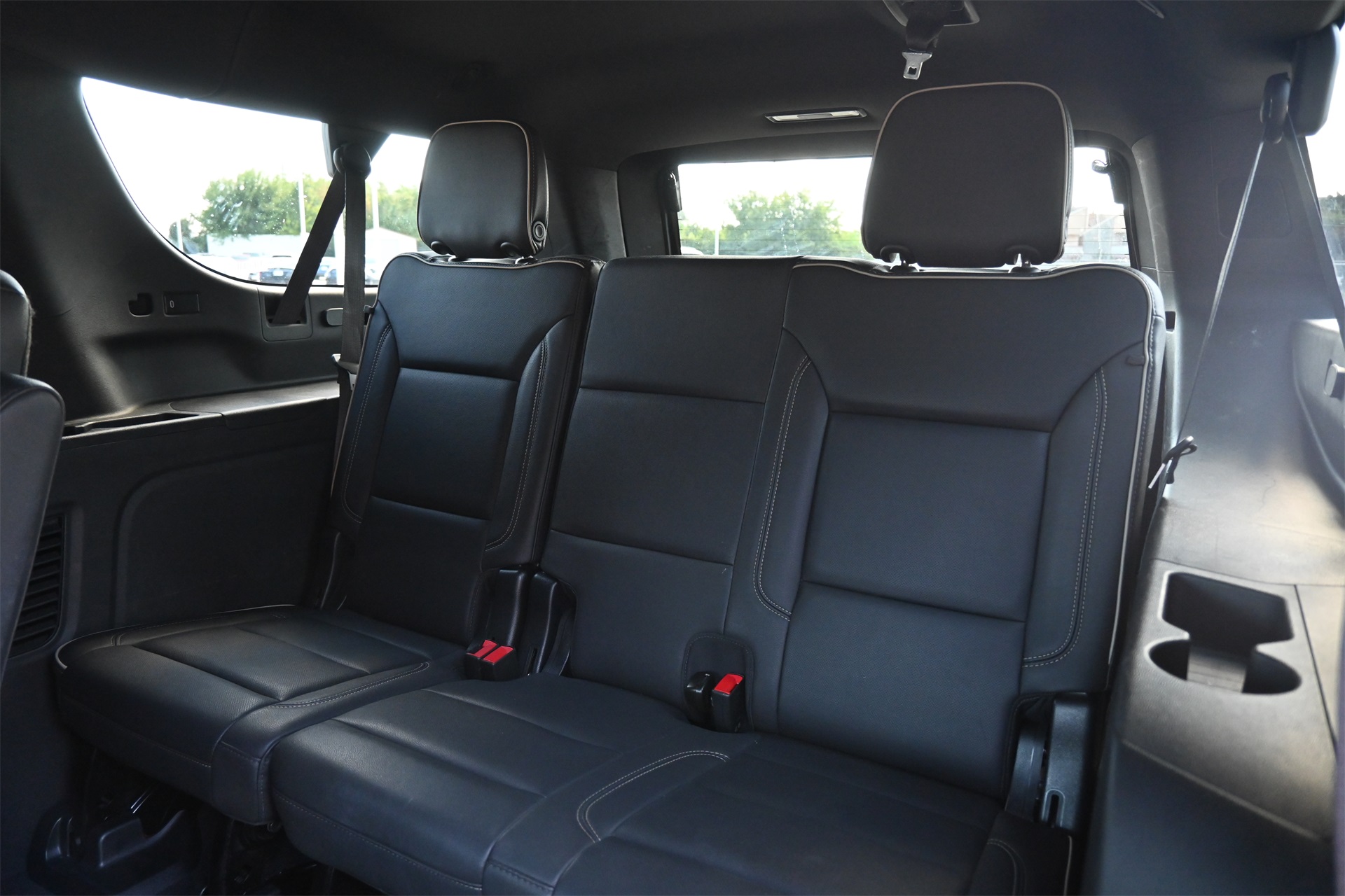 rror, Auto-dimming Rear-View mirror, Auto-leveling suspension, Automatic temperature control, Bose 10-Speaker Surround w/CenterPoint, Brake assist, Bright Front & Rear Door Sill Plates, Bumpers: body-color, Chrome Door Handles w/Body-Color Strip, Chrome Mirror Caps, Color-Keyed Carpeting Floor Covering, Compass, Delay-off headlights, Driver & Front Outboard Passenger Airbags, Driver door bin, Driver vanity mirror, Dual Exhaust System, Dual front impact airbags, Dual front side impact airbags, Electronic Stability Control, Emergency communication system: OnStar and Chevrolet connected services capable, Enhanced Driver Information Center, Floor Console, Four wheel independent suspension, Front anti-roll bar, Front Bucket Seats, Front Center Armrest, Front dual zone A/C, Front reading lights, Fully automatic headlights, Garage door transmitter, Hands-Free Rear Power Programmable Liftgate, Heated & Ventilated Driver & Front Passenger Seats, Heated 2nd Row Outboard Seats, Heated door mirrors, Heated Driver & Front Passenger Seats, Heated front seats, Heated rear seats, Heated Steering Wheel, Heated steering wheel, Illuminated entry, Infotainment Display, Lane Change Alert w/Side Blind Zone Alert, LED Daytime Running Lamps, Low tire pressure warning, Magnetic Ride Control Suspension, Memory seat, Memory Settings, Navigation System, Occupant sensing airbag, Outside Heated Power-Adjustable Mirrors, Outside temperature display, Overhead airbag, Overhead console, Panic alarm, Passenger door bin, Passenger vanity mirror, Perforated Leather Seating Surfaces, Power door mirrors, Power driver seat, Power Liftgate, Power passenger seat, Power Release 2nd Row Bucket Seats, Power steering, Power Tilt & Telescopic Steering Column, Power windows, Premium audio system: Chevrolet Infotainment 3 Premium, Radio: Chevrolet Infotainment 3 Premium System, Rain sensing wipers, Rear air conditioning, Rear anti-roll bar, Rear Cross Traffic Alert, Rear reading lights, Rear window defroster, Rear window wiper, Remote keyless entry, Remote Start, Roof rack: rails only, Safety Alert Seat, Security system, SiriusXM Radio w/360L, Speed control, Speed-sensing steering, Split folding rear seat, Spoiler, Steering wheel memory, Steering wheel mounted audio controls, Tachometer, Telescoping steering wheel, Tilt steering wheel, Traction control, Trip computer, Turn signal indicator mirrors, Universal Home Remote, Variably intermittent wipers, Ventilated front seats, Voltmeter, Wireless Charging, and Wrapped Steering Wheel. Dark Ash Metallic RWD 10-Speed Automatic with Overdrive EcoTec3 5.3L V8 CARFAX 1-Owner, Clean CARFAX!, Non-Smoker, Bluetooth, Apple Carplay / Android Auto, Heated Seats, Cooled Seats.