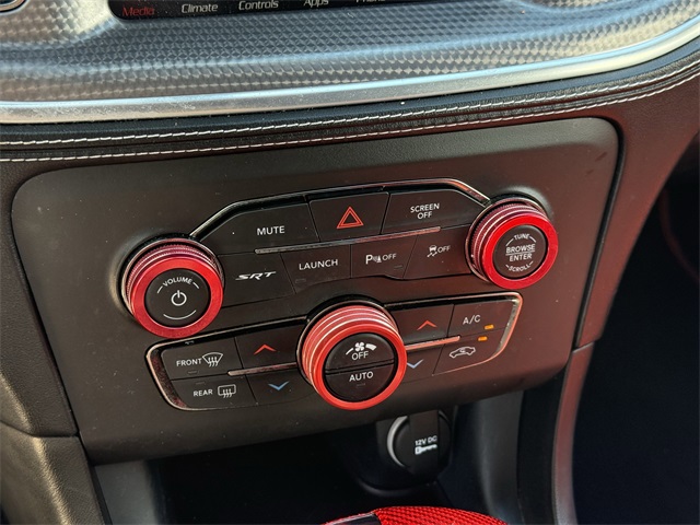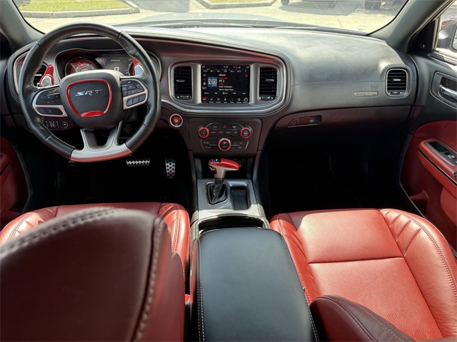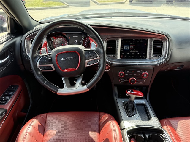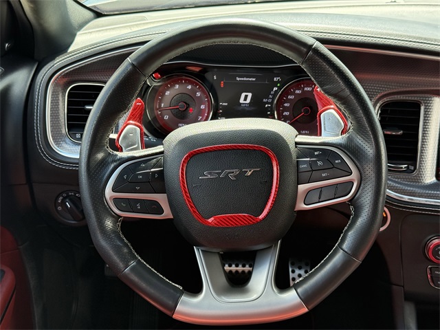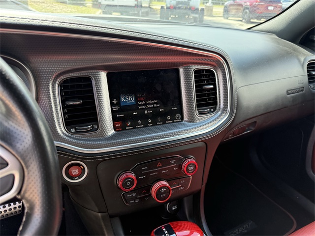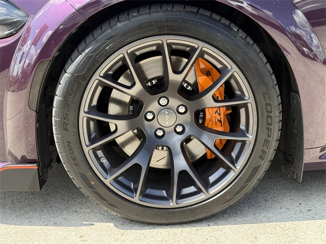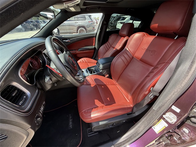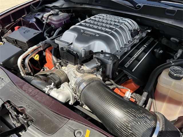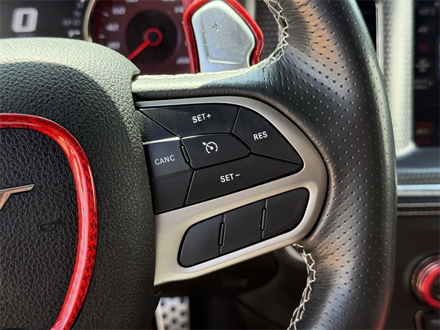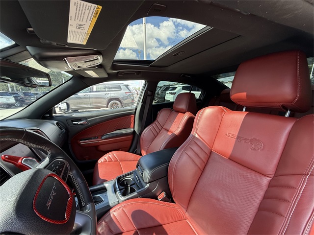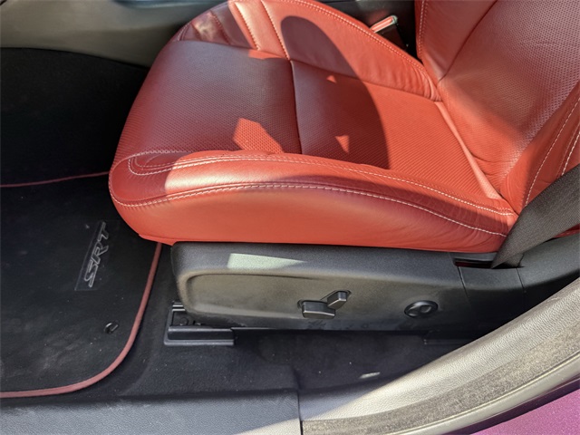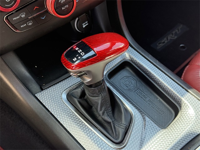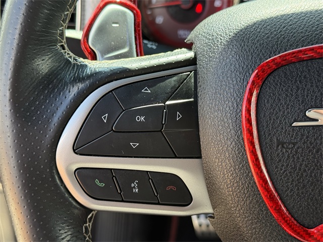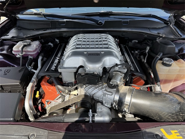 in, Driver vanity mirror, Dual front impact airbags, Dual front side impact airbags, Electronic Stability Control, Emergency communication system: SiriusXM Guardian, Four wheel independent suspension, Front anti-roll bar, Front Bucket Seats, Front Center Armrest, Front dual zone A/C, Front License Plate Bracket, Front reading lights, Fully automatic headlights, Garage door transmitter: HomeLink, Heated door mirrors, Heated front seats, Heated rear seats, Heated steering wheel, Hellcat Logo Laguna Leather Seat, High intensity discharge headlights: Bi-Xenon, Illuminated entry, Knee airbag, Low tire pressure warning, Memory seat, Occupant sensing airbag, Overhead airbag, Overhead console, Panic alarm, ParkView Rear Back-Up Camera, Passenger door bin, Power door mirrors, Power driver seat, Power passenger seat, Power Sunroof, Quick Order Package 23T SRT Hellcat, Radio: Uconnect 4C w/8.4" Display, Rear anti-roll bar, Remote keyless entry, Security system, Speed control, Speed-Sensitive Wipers, Split folding rear seat, Spoiler, Sport steering wheel, Steering wheel mounted audio controls, Telescoping steering wheel, Traction control, Variably intermittent wipers, Ventilated front seats, Wheels: 20" x 11" Carbon Black Aluminum, Wheels: 20" x 11" Warp Speed Granite. CARFAX One-Owner.